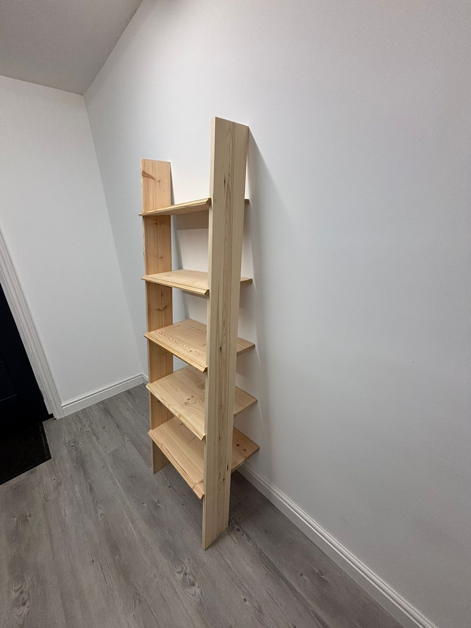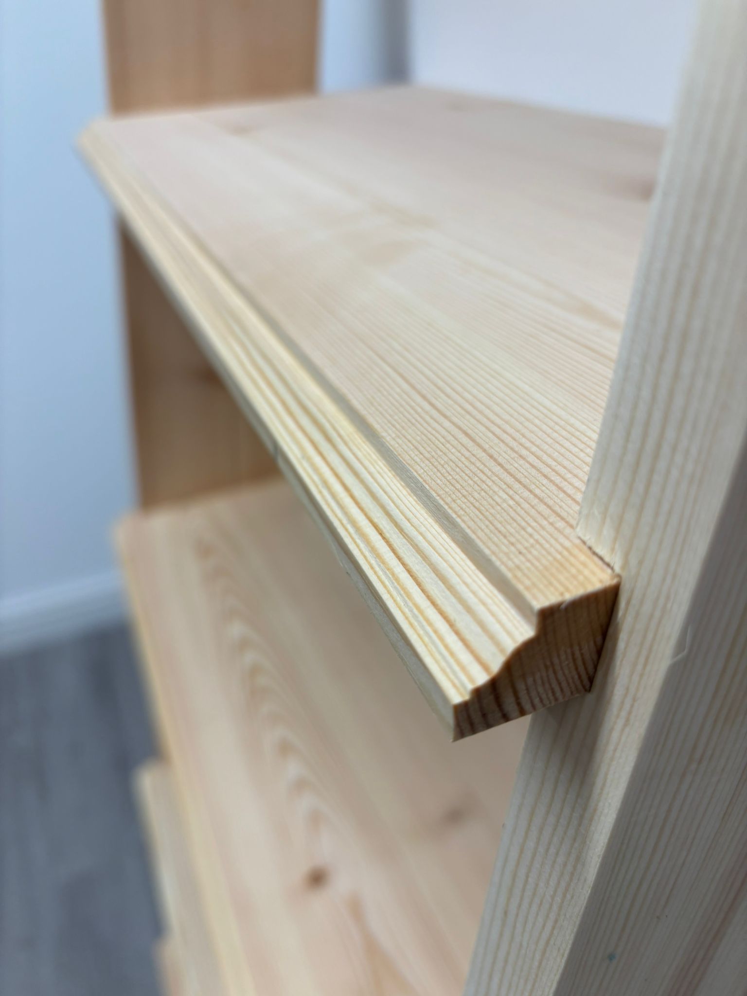 Although the sides lean against the wall at an angle, the shelves remain parallel to the floor, creating the look of a leaning ladder. The fronts of the shelves are finished with a Classic profile using the Router Table, whilst the shelf sides are created using the portable hand-held Router.