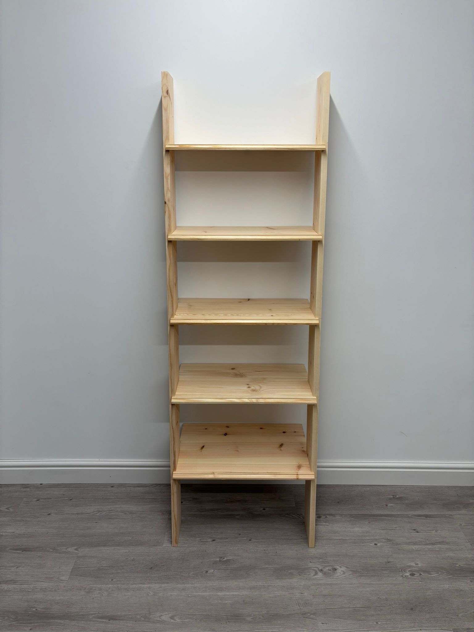 The depth of the shelves varies on each shelf to ensure the back of the shelves sits flush against the wall, accommodating books of different depths.