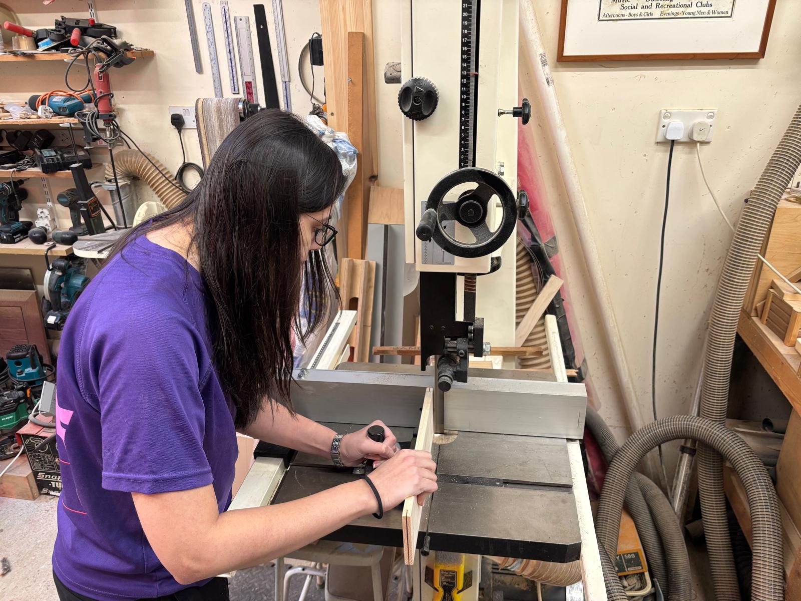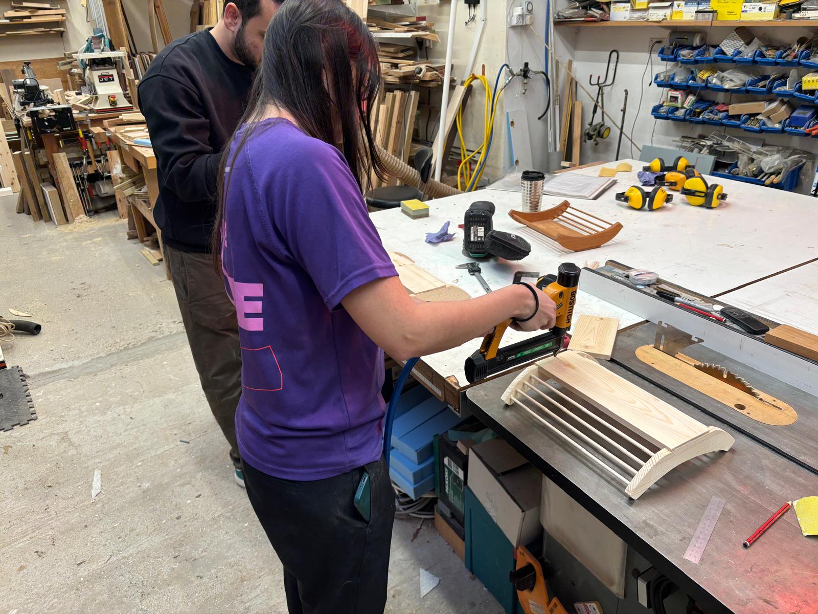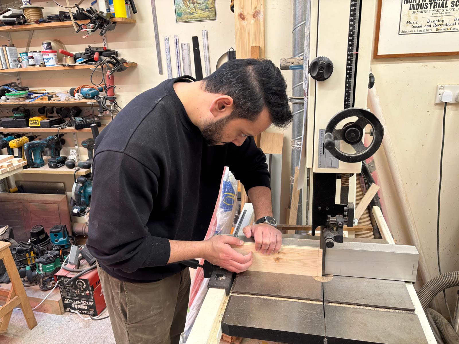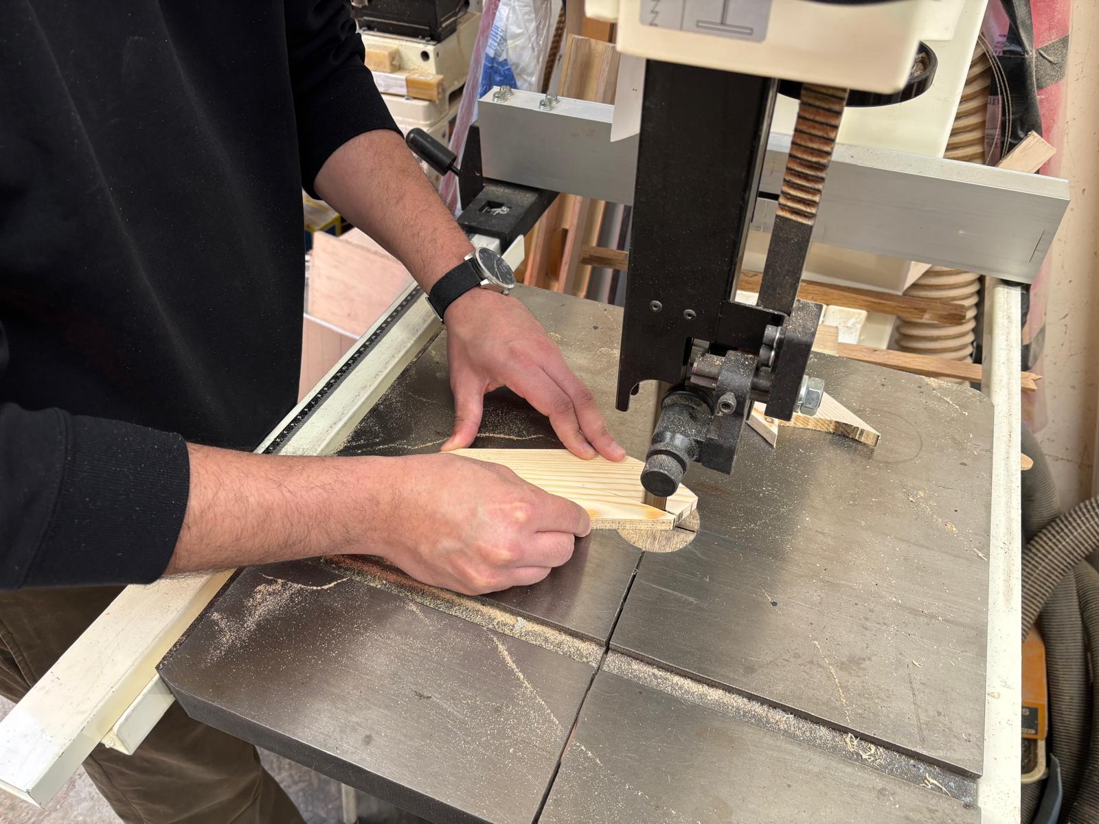 Tools involved with this build include the bandsaw/jigsaw to cut out the shaped ends and finished on the oscillating spindle sander then face sanded with the random orbit sander. Next the ends are machined on the drill press to take the dowel rods that create this light and delicate design.
