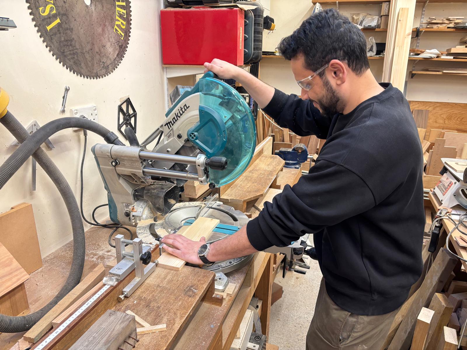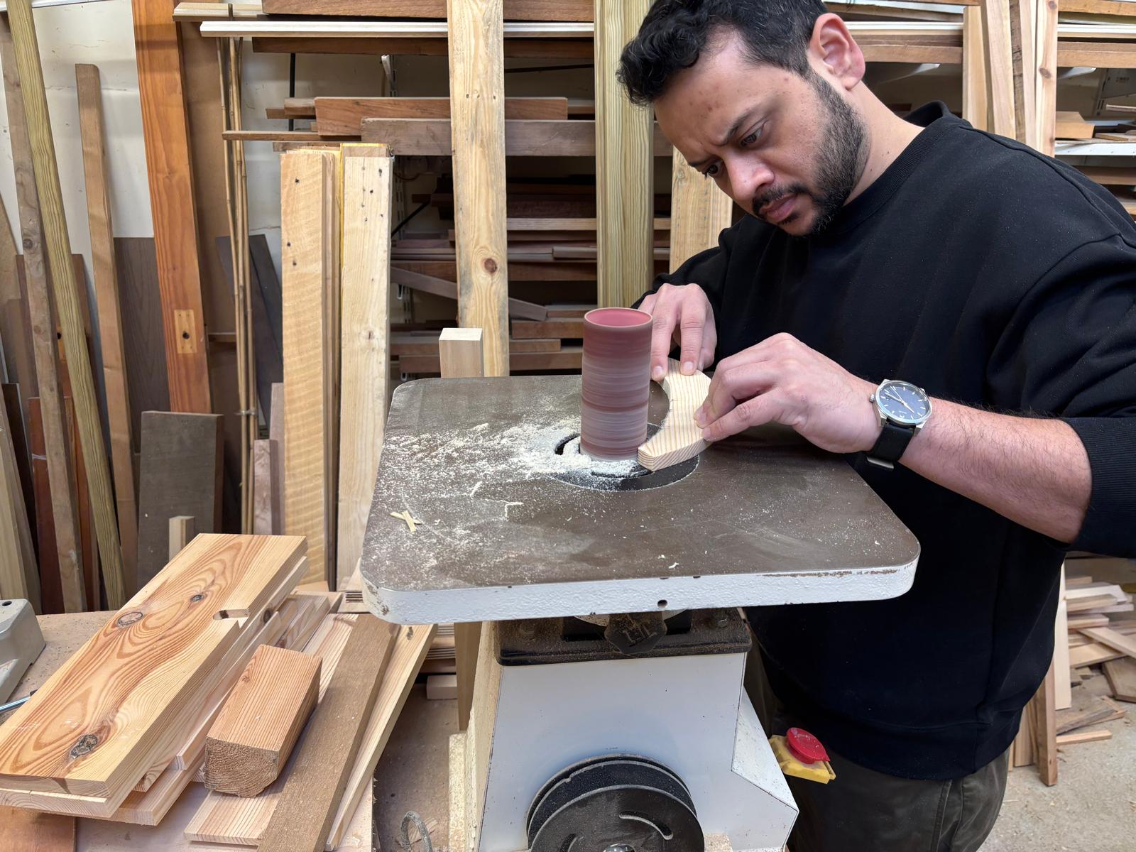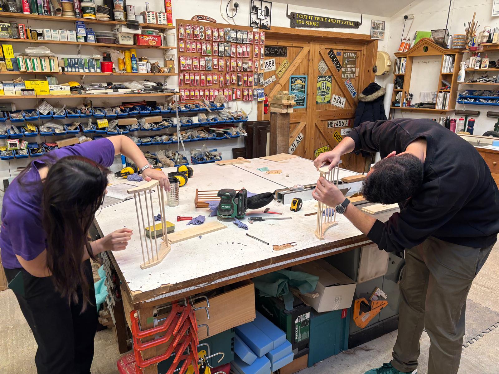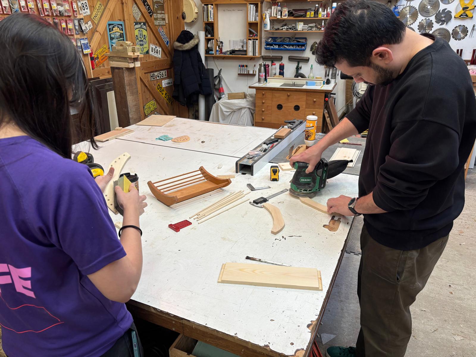 Tools involved with this build include the bandsaw/jigsaw to cut out the shaped ends and finished on the oscillating spindle sander then face sanded with the random orbit sander. Next the ends are machined on the drill press to take the dowel rods that create this light and delicate design.